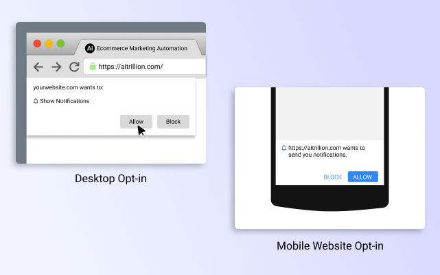 In the case of Web Push opt-ins, your store visitors only have to click the “Allow” button on the popup. Once the visitors hit the allow button, their browser information is imported, which you can use to target them with push notifications.