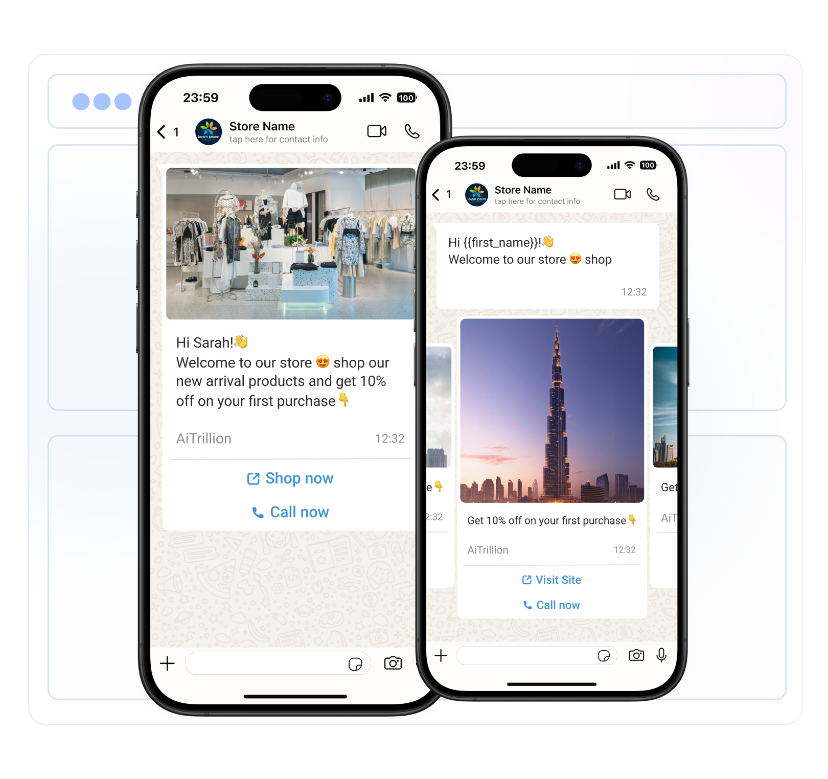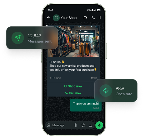 New on AiTrillion Platform WhatsApp Marketing for Shopify Turn WhatsApp into Your Highest-Converting Sales Channel Reach your customers where they already are. Send mass campaigns, automate workflows, and drive 5x more conversions with WhatsApp — all inside AiTrillion. Start freeBook a demo One platform, endless possibilities AiTrillion brings WhatsApp marketing together with email, SMS, loyalty, and more — so you never need another tool. Mass WhatsApp Sending Broadcast campaigns to thousands of customers instantly with personalized messages that feel one-on-one. Workflow Automations Set up trigger-based automations for cart recovery, order updates, and win-back campaigns. WhatsApp Live Chat Real-time customer support widget for your Shopify store. Resolve queries and close sales faster. Template Gallery 200+ pre-approved, conversion- optimized templates for every scenario — ready to customize and send. Email + SMS + WhatsApp Orchestrate omnichannel campaigns that reach customers on their preferred channel automatically. Reviews & Ratings Trigger WhatsApp review requests post- purchase. Collect 3x more reviews with conversational prompts. Loyalty & Rewards Notify members about points, tiers, and exclusive rewards via WhatsApp for higher engagement. Affiliate & Memberships Keep affiliates and members in the loop with instant WhatsApp notifications and commission updates. WhatsApp outperforms every channel 98% Open Rate vs 20% for email 45% Click-Through Rate 5x higher than SMS 5x More Conversions compared to traditional < 3 min Setup Time start sending today Complete WhatsApp Engagement Suite Design intelligent workflows, send personalized campaigns, and deliver seamless customer conversations effortlessly. WhatsApp Messaging Automation Automate, Personalize & Scale WhatsApp Engagement Turn customer actions into automated WhatsApp workflows that send the right message at the right time. Trigger personalized messages, automate follow-ups, and streamline customer journeys without manual effort. Inventory workflows Customers loyalty workflows Customer workflows Order workflows Product workflows WhatsApp Broadcasting Plan, Broadcast & Convert Smarter on WhatsApp Reach the right customers with targeted WhatsApp campaigns designed to drive engagement and sales. Create personalized messages, send them at scale, and track performance to maximize campaign impact. Dynamic discount Audience segmentation WhatsApp Team Inbox Your WhatsApp conversations, finally organized One shared inbox for your entire team. No missed messages, no lost context; just fast, personal customer support at scale. Real-time status tracking Full customer profiles Rich media messaging Conversation tagging Internal notes Works with your flows WhatsApp Chat Capture, Route & Respond Smarter on WhatsApp Collect customer information upfront, trigger ready-to-send messages instantly, and route conversations to the right operator for quicker, more effective engagement. Customer details form Pre-filled message Operator’s availability Re-engage with different modules Customer Journey: Subscriber to Affiliate 1 Subscriber Capture leads with WhatsApp opt-ins and welcome automations 2 Customer Convert with abandoned cart recovery and order notifications 3 Member Upgrade to loyalty program with points and exclusive perks 4 Affiliate Turn top customers into brand advocates earning commissions Driving growth for brands like yours Unlock the full potential of WhatsApp as your most powerful customer acquisition channel. 60% faster sales cycle 81% conversion rate with AI Agents 40.5X more ROI 116% Average conversion rate 312.5% Revenue Growth 207% Boost in Retention Trusted by 3,000+ Shopify Brands Join thousands of successful eCommerce businesses using AiTrillion to streamline their marketing and boost customer engagement. 3,000+ active Shopify stores 400M+ automated messages sent 100M+ loyalty points redeemed Frequently asked questions about WhatsApp chatDo I need a WhatsApp Business API account?Yes. you need WhatsApp api Account. What processes can I automate with the help of your app?The app provides multiple triggers and actions, so you can automate many processes. For example, you can add marketing tags, send every day report with low stock items, inform about the high-risk order, send a reminder about unfulfilled order to the store owner, etc. What will happen if I reach the limit of the available credits gets exhausted?Yes. you need WhatsApp If you reach the limit, your workflow will continue working. But each subsequent launch over the limit will cost an additional usage fee according to your subscription plan. Note that usage fee will be charged even during the trial period.